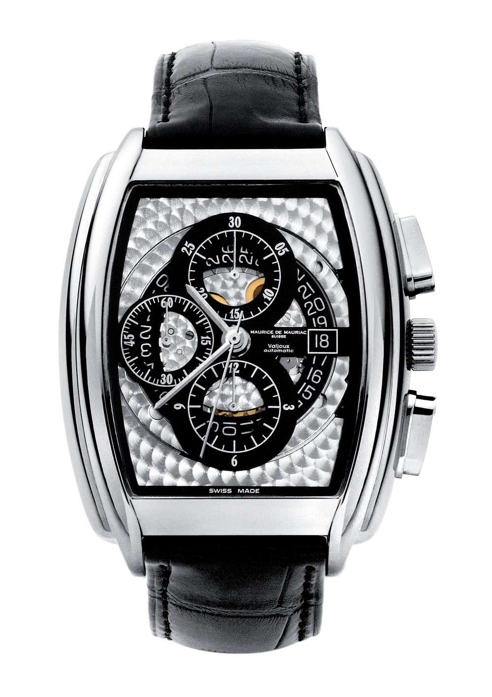 Playing on the contrast between black and white, the skeleton Tonneau XL chronometer from Maurice de Mauriac is distinguished by its original design. It is signed by Daniel Dreifuss, the brand’s designer, who works with his wife, the painter and stylist Claudia Ginocchio.