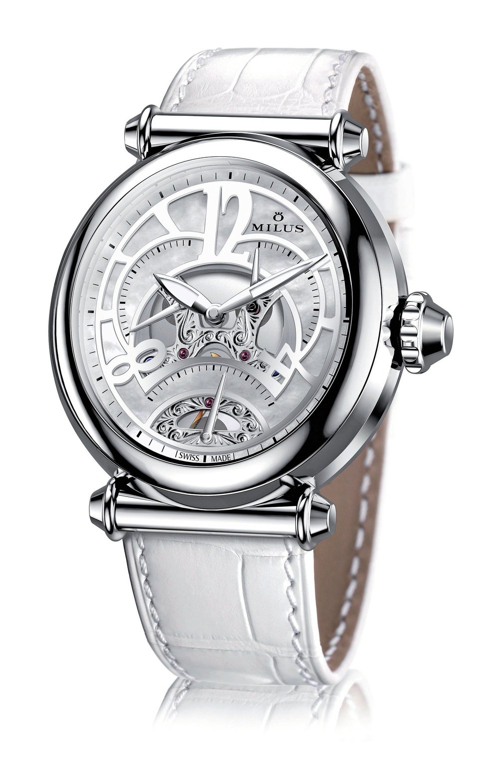 A ladies’ watch with mechanical characteristics. The very latest Milus timepiece can only be described as extravagant and irresistible. Comprising three different levels, the dial provides a view of two hand-engraved components, making the ballet performed by the hands even more captivating. The subtlety of the watch gives it a light and leisurely air that is particularly attractive.