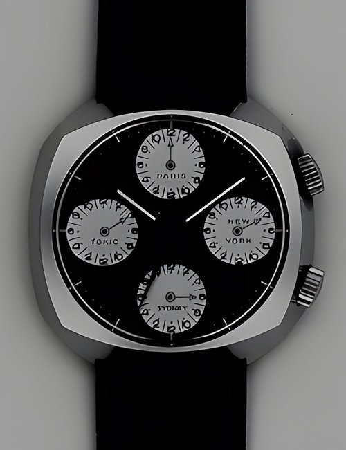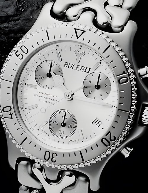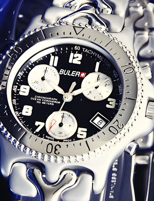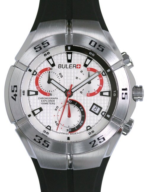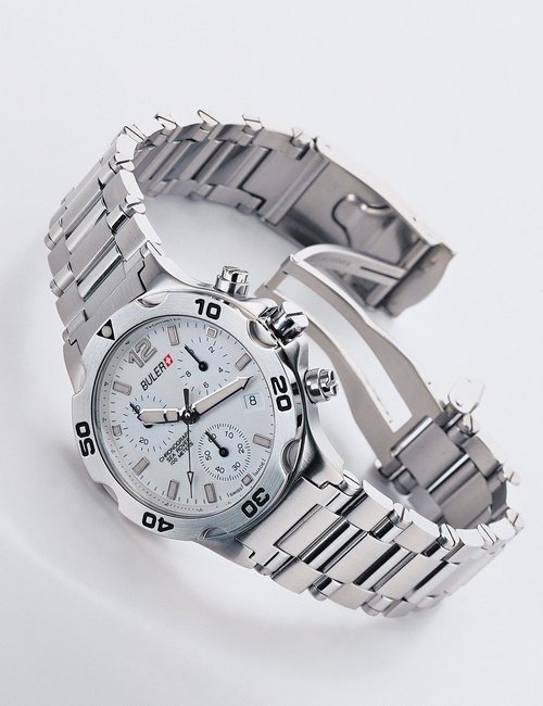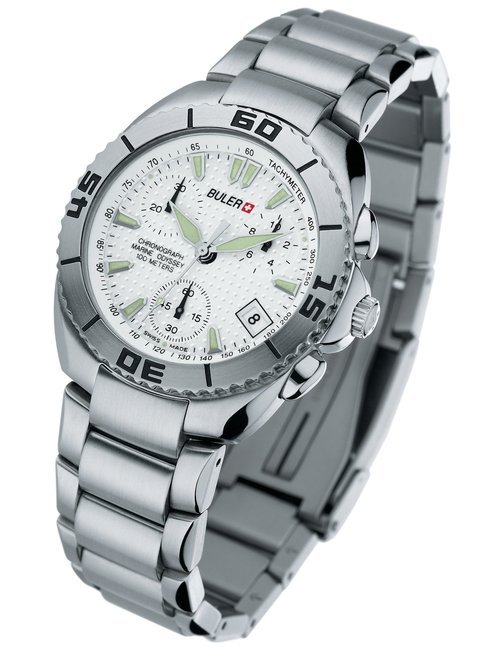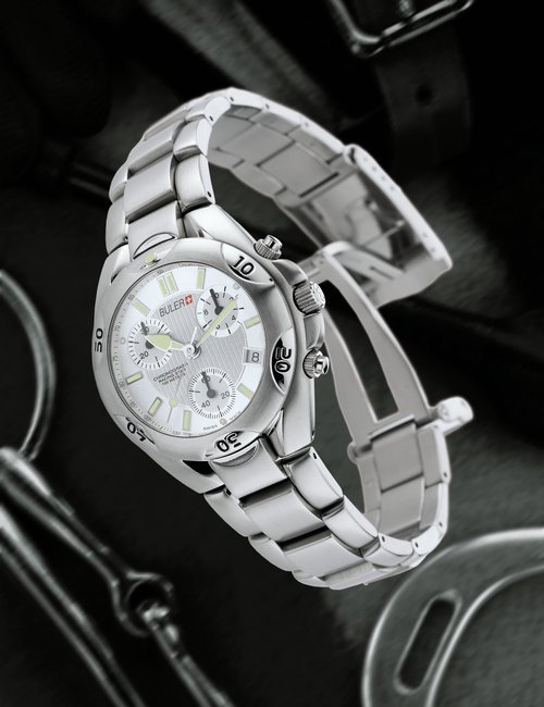 Silvered counters: 30-minutes at 10 o'clock, small seconds at 6 o'clock and 1/10 second at 2 o'clock