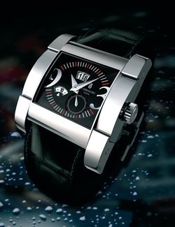 Rhodium-plated windows: large date at 12 o'clock, months at 8 o'clock