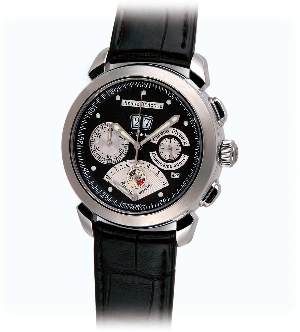 Watchmaking know-how is sublimated by Pierre DeRoche in a new timepiece endowed with an array of complications that is unique in the field of chronographs. 60-minute and retrograde 6-hour counters, flyback function, large date, power-reserve and raised windingstem mechanism. This combination of complications represents a successful blend of technical sophistication, aesthetic elegance and sophistication. Its polished and satin-brushed steel case, black guilloché dial and sapphire crystal case-back provide a majestic setting for an exceptional movement.