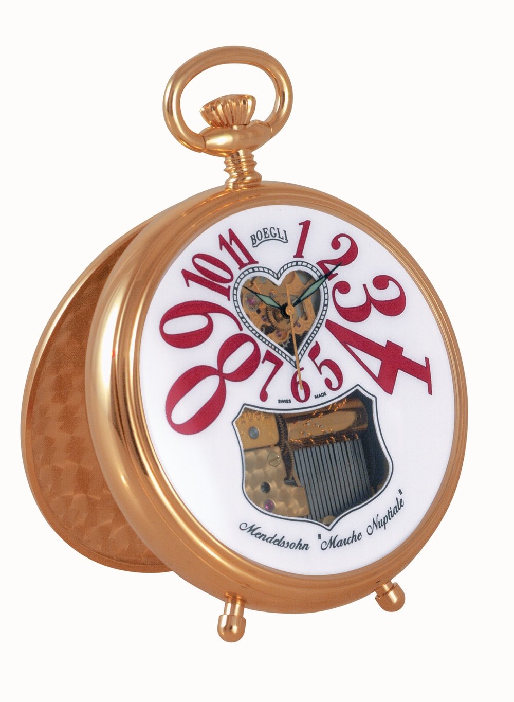 An ode to “Grand Amour” through the famous Mendelssohn air, this watch can either be worn as a pocket watch or displayed as a clock. The heart-shaped opening reveals a decorated movement, while the miniature musical mechanism is visible through the second cut-out.