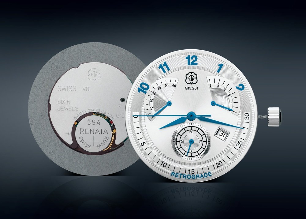 ETA has converted its 10½ line chronograph movement to give a retrograde display of the timed periods, in a counter-clockwise direction in some cases. This combination makes for a surprising spectacle on the dial. Different exteriors are possible.