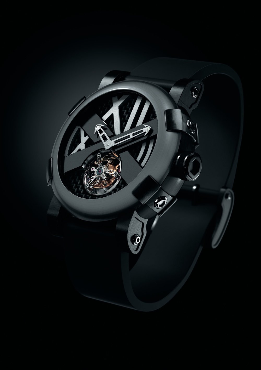 Full-skin crocodile leather or black rubber with black satin-finished steel buckle