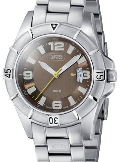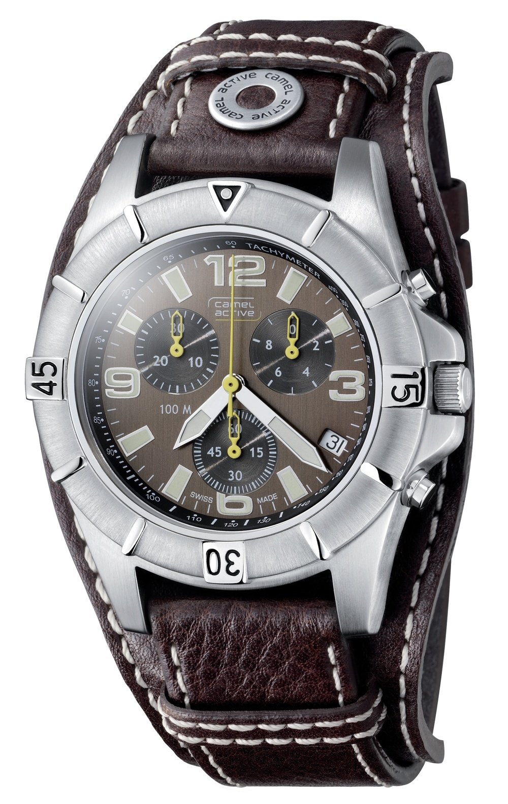 A masculine statement on the wrist: 44 millimetres of stainless steel and Swiss technology. Camel Active’s distinctive massive unidirectional bezel is combined with a go-through strap, luminescent hands and hour-markers and characteristic brown dial with horizontal rays. This reliable companion stands for performance, quality and style.