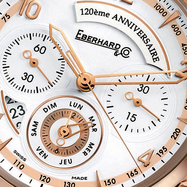 A sparkling anniversary for Eberhard & Co! One hundred and twenty years of know-how, elegance and meticulous attention to detail are celebrated with this sumptuous chronograph, now offered in pink gold following its tremendous success in 2007. The refined movement, with its very special rotor, and the magnificently-worked finishing will write a new page in the history of this venerable watch manufactory.