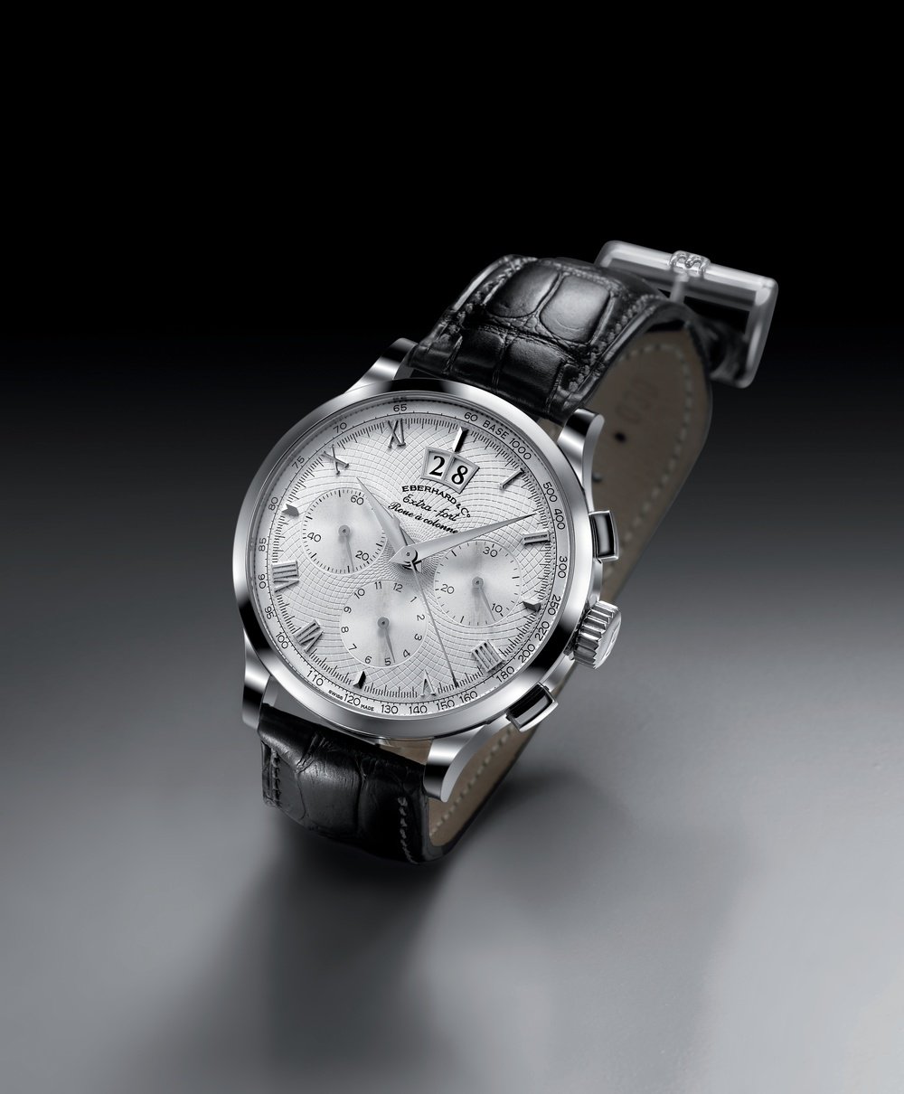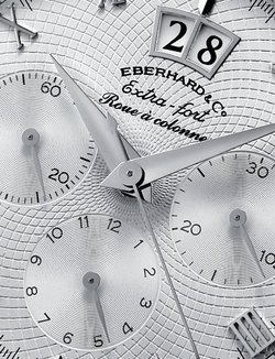 Eberhard is proud to unveil its new white gold chronograph, in which aesthetics and mechanical sophistication are brought together in a perfect harmony of tradition and innovation. To the great satisfaction of sportsmen and women, a column wheel prevents the chronograph hand from accidentally returning to zero when the chronograph function is activated. The large, white gold case combines the relaxed ease of wearing steel with the exclusive beauty of precious materials.