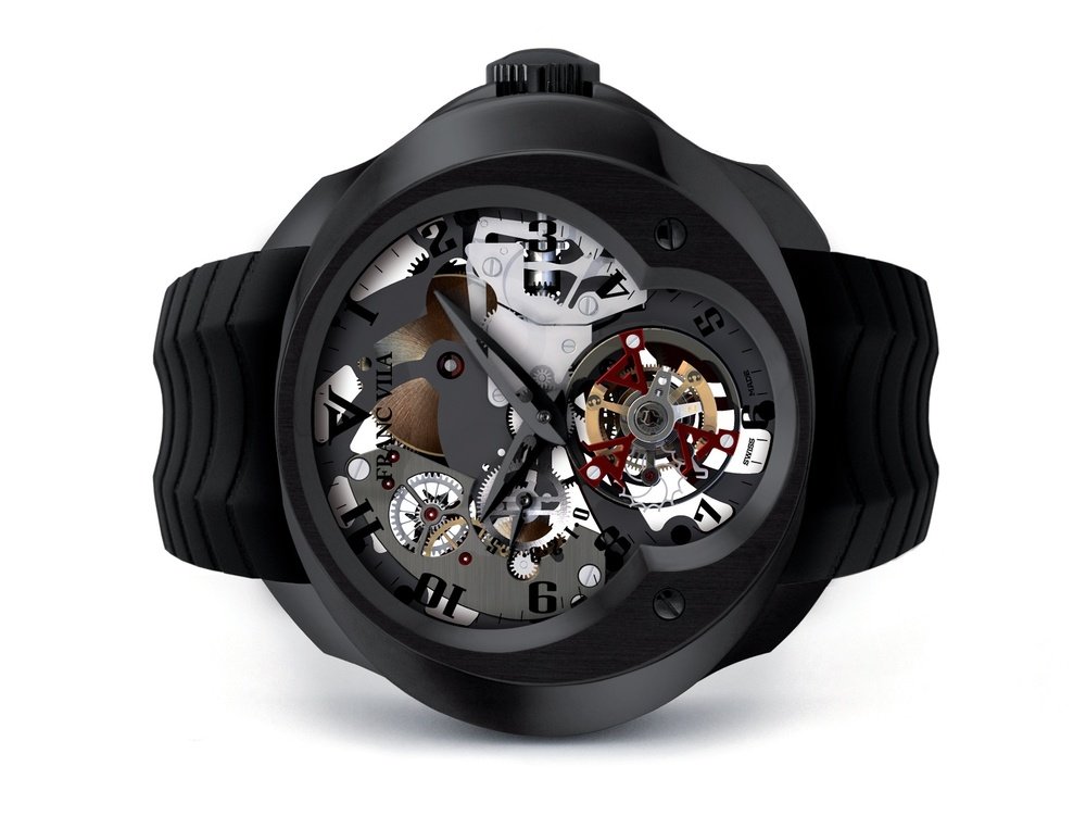At the crossroads of contemporary art, architecture and engineering, Franc Vila’s Esprit Unique makes another very strong statement. Even more impressive than the aesthetic quest for pure refinement is its technical prowess. This timepiece, with its differential gears system, houses a flying tourbillon made of lightnium, a new alloy of lithium and aluminium, and is offered in a limited edition of 8. The structured design of this mechanism has its roots in modern architecture and, as lightnium is an extremely light material, the mechanism has been pierced.