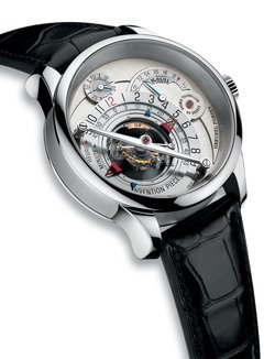 The Invention Piece 1 pays tribute to the Double Tourbillon 30°, the first Fundamental Invention by Robert Greubel & Stephen Forsey and the fruit of 4 years’ patient research. In a restructuring of volume and surface, the emblematic double cage is placed at the centre of an innovative display: two triangular indicators – red for the hours, blue for the minutes – show the passing of time on one half of two of the concentric rings on the movement. This sumptuous timepiece, a veritable sculpture on the wrist that comes in 3 unique series (5N red gold, white gold and platinum), has another surprise in store on the back: the story of the Invention engraved in relief on a gold plate.