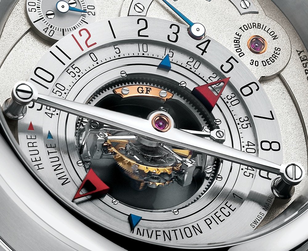 Patented hand-wound, GF 02N calibre, Double Tourbillon (one inside at an angle of 30°, the other outside), 38 jewels, 21,600 vib/h, 72-hour power reserve