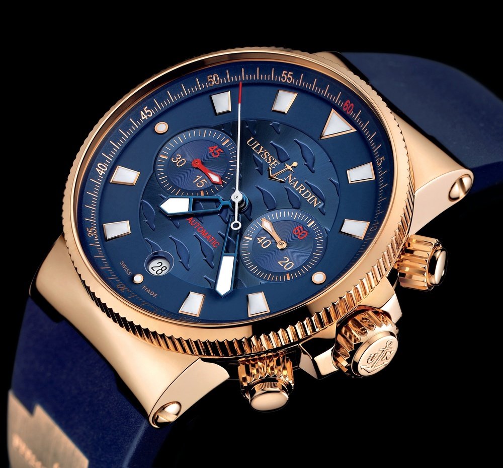 Designed for use in extreme conditions, the distinctive Maxi Marine Chronograph features an exclusive 45-minute counter with an instantaneous return-to-zero function for the recorded minutes and seconds. An eagerly-awaited addition to the now-classic marine line, this chronograph is being produced in a limited series of 999. It houses a spectacular movement with a blue titanium alloy coating applied by the ionic bombardment process. A wind of the purest aestheticism blows across the waves.