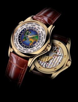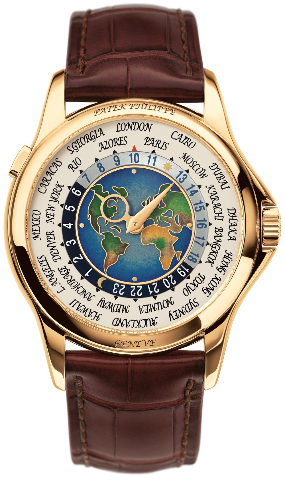 The World Time, one of Patek Philippe’s emblematic complications, is highly sought-after by collectors, as are the famous and very rare world time models from the 40’s and 50’s. This exclusive model in yellow gold is beautifully decorated with a cloisonné enamel world map on the dial and an engraving on the bezel. The 24 time zones on their respective disks and the day/night indicator are very legible.