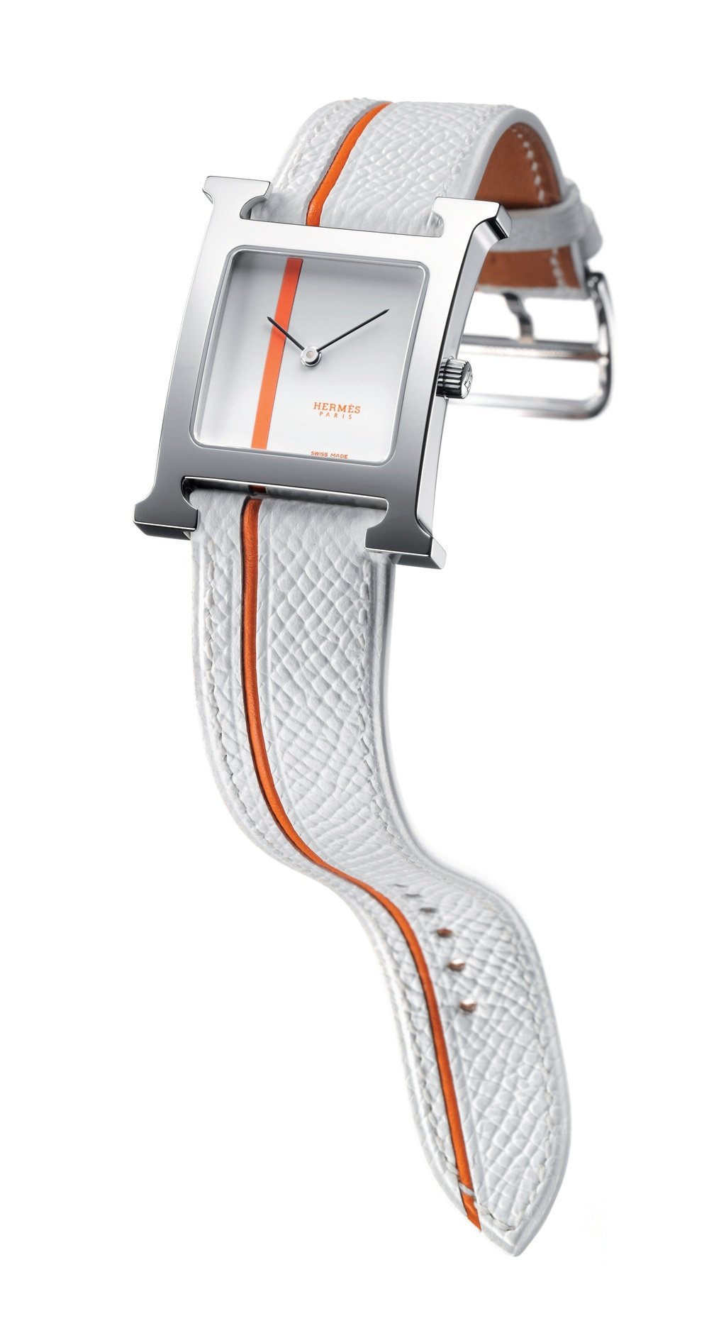 Inspired by the Hermès Oxford belt, the latest H–Hour creation is marked by a resolutely sport-chic character. A very trendy orange line runs from one end of the watch to the other, passing gracefully through the emblematic H of 24, Faubourg Saint-Honoré. Available in two sizes and with a choice of three colours – white, brown or black.