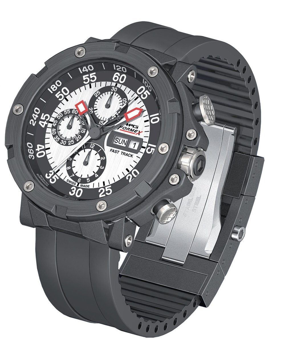Inspired by the sport of automobile racing, the Fast Track collection opens up new perspectives in the field of progressive technology. The strap/bracelet is integrated with the bezel and, thanks to its Formex patented active case suspension system, offers incomparable comfort and performance.