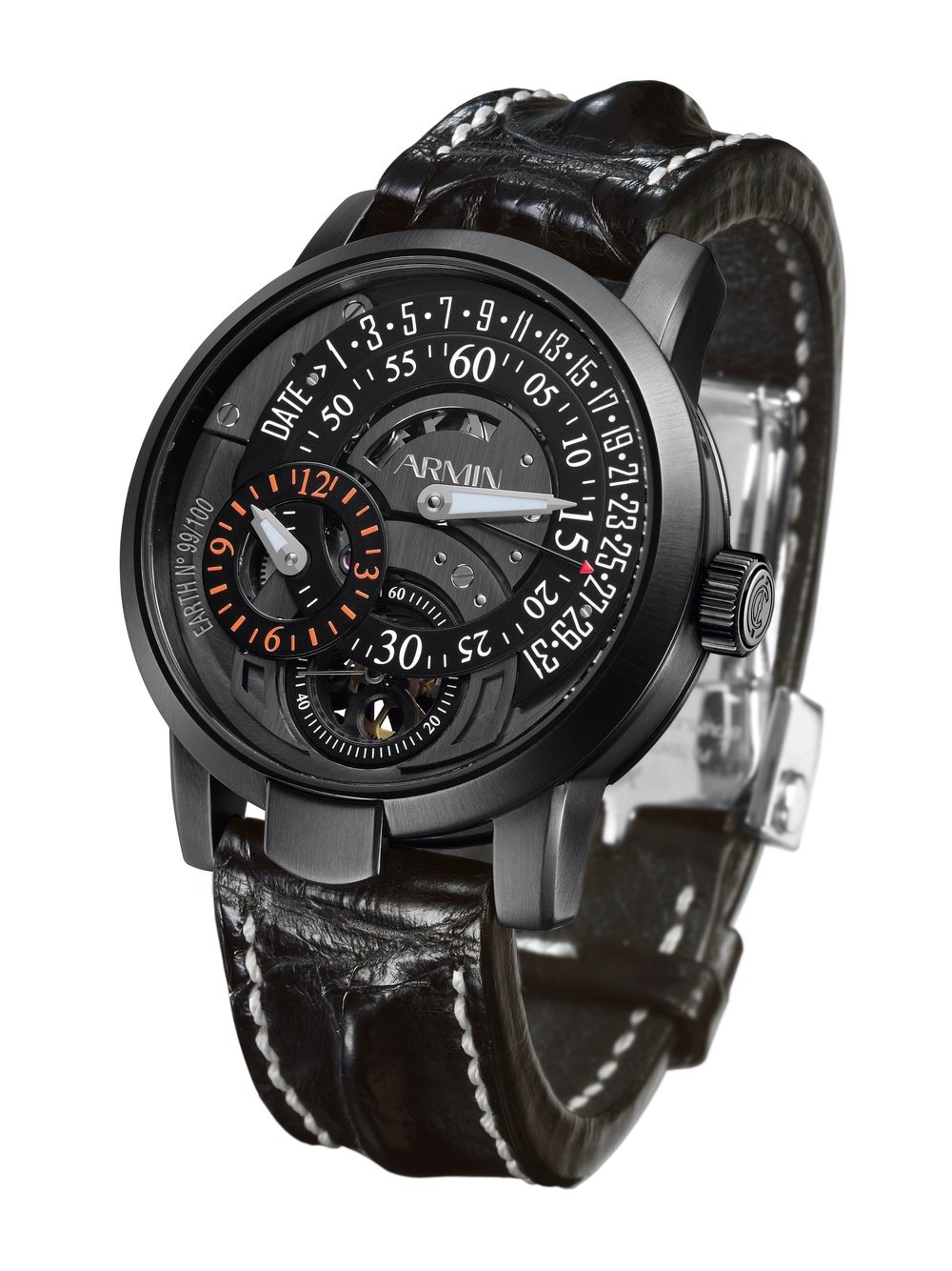 An innovative engraved movement, retrograde date display, off-centre minute-regulator, as well as hour and small seconds counters, all housed in a black PVD brushed titanium case. The Earth model promises more astonishing surprises with the other three watches in the series, Water, Air and Fire, with each model reflecting a natural element through its design and colour.