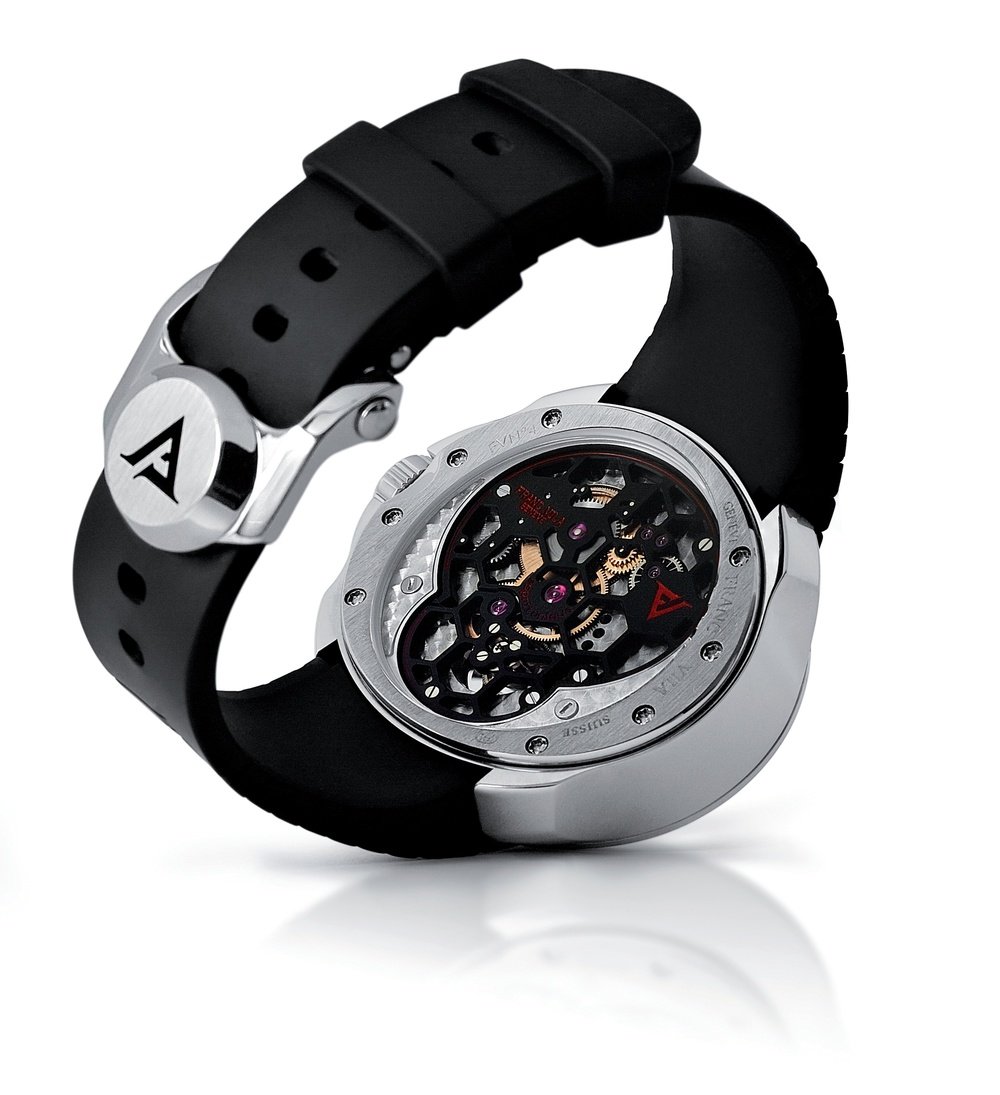 A year after the appearance of its famous FVa N° 6 SuperLigero Concept, Franc Vila now introduces a flying chronograph tourbillon based on nanotechnology. The new movement, like last year’s, is made of lightnium, but the design of the bridges has been inspired by the molecular structure of graphene, a recently discovered material. While its density is very low, with a thickness equivalent to an atom, it is 10 to 100 times more resistant than steel and much harder than diamond. By translating the hexagonal nano-structure of graphene into the language of haute horlogerie, Franc Vila has met a longstanding challenge: to create an infinitely light, ultra-resistant movement. Limited edition of 8.