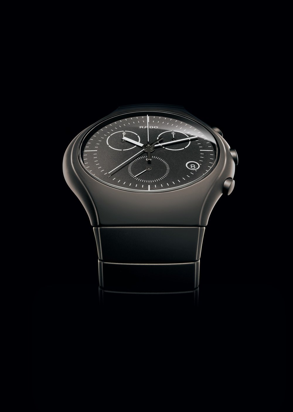 The all-ceramic True collection is an invitation to enter the world of Rado. It features a unique coating technique which reproduces the colour of platinum with an exceptional matt aspect. By absorbing the light, the ceramic is enriched with deep grey-brown tones. The dial underlines the monochromatic aspect of the piece, displaying its split-seconds chronograph counters, while two rows of hourmarkers, each with its own direct-drive hand, measure the seconds and minutes. The contemporary True Chronograph Platinum Matt is generous in size, unpretentious in appearance.