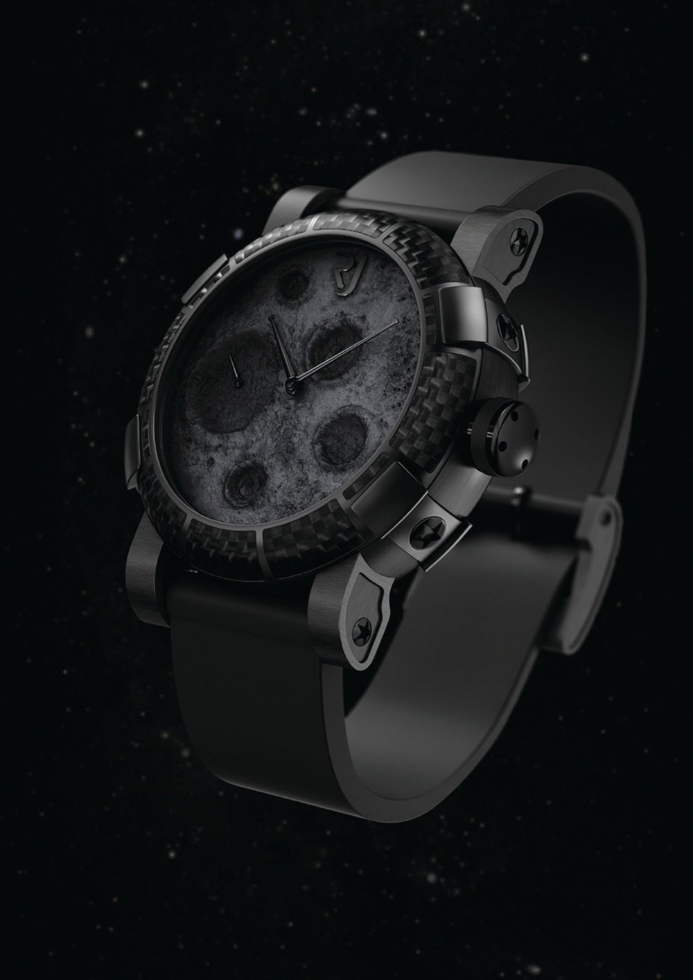 The moon reveals its dark side in this mysterious all-black composition. The authentic moon dust on the dial, the titanium and steel fused with metal from Apollo XI for the case, and the claws in ceramic or oxidised steel from the Soyuz spacecraft, all serve to increase its enigma.