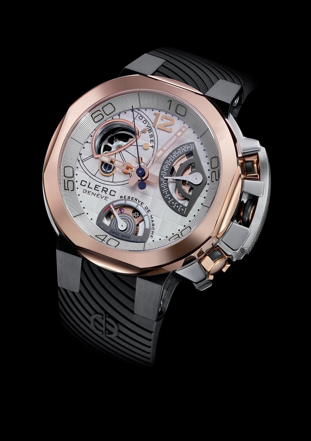 The Clerc watch company presents the Odyssey, an haute horlogerie timepiece with a complex structure inspired by space research and exploration. Fashioned in precious, high-tech materials, its case features a revolutionary device for protecting the crown, pushpieces and interior rotating bezel system.