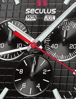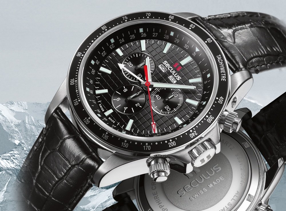 Hours, minutes, seconds, day, date, month, 1/10th second chronograph and tachometer scale