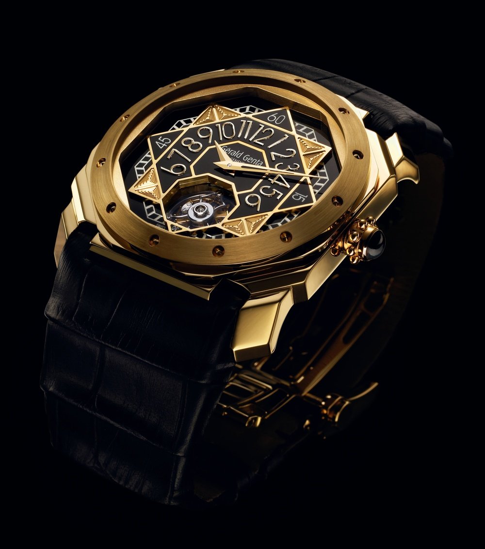 The legendary octagonal Octo case, testimony to the modernity Gérald Genta has brought to watchmaking, returns in a Tourbillon Sunray version. The two yellow gold plates making up the dial reveal a retrograde hour on a black lacquer ground, while an octagonal window highlights a beautifully constructed tourbillon. The final act of splendour in this dazzling composition, – a veritable ode to the sun –, is the manufactory-made movement, coated with old gold. This is the Gérald Genta signature, the “Potter finish”, so typical of vintage movements.
