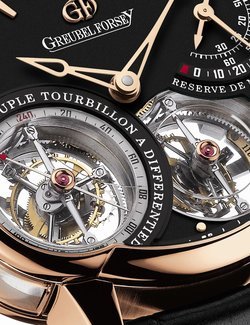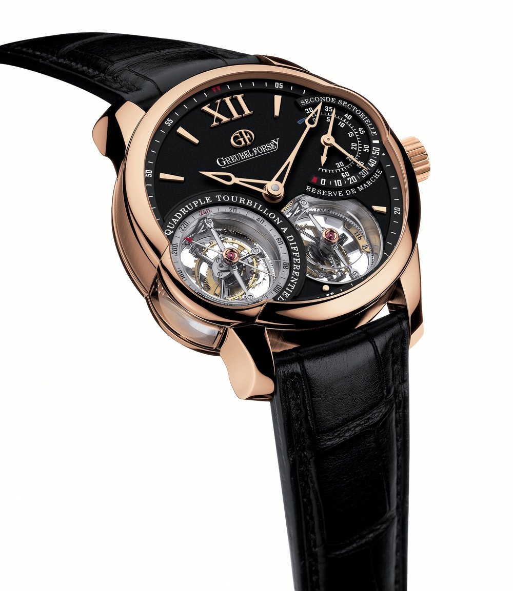 Patented hand-wound, comprising 531 components, four independent tourbillons housed in two double cages, 63 rubies, 21,600 vib/h, rapid-rotation double barrel in series, 50-hour power reserve