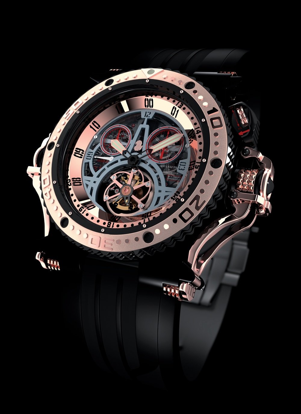 Aquanautic introduces its very first tourbillon in an eye-catching composition. A combination of technological excellence, robustness, refinement and luxury, the Super King Diving Tourbillon brings together performance and perfection: the performance of its BNB movement and the optimum security provided by its exceptional legibility, double-crown locking system and 5-day power reserve; the perfection of the workmanship, from the design to the materials used. With this model, a dream becomes reality.