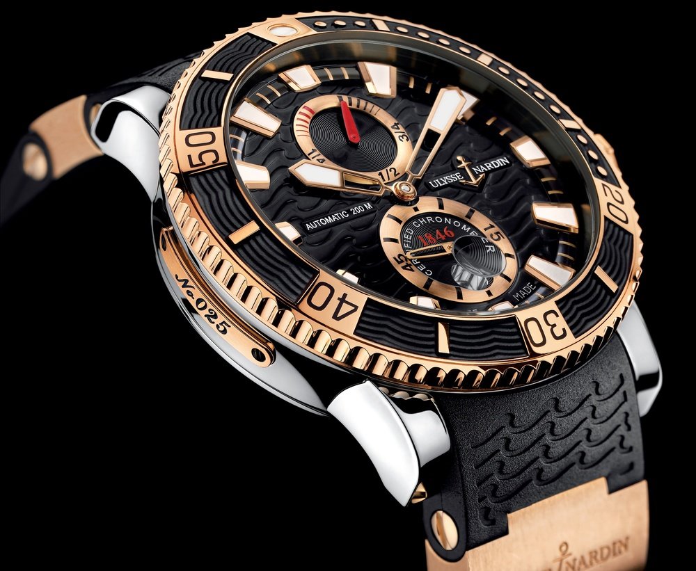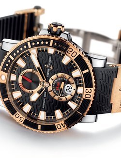 A new titanium version of the highly emblematic Maxi Marine Diver. This COSC-certified chronometer is housed in a new sporty 45-mm titanium case equipped with a structured unidirectional rotating bezel in alternating titanium and pink gold. Added to this are such useful functions as a power reserve indicator and an extra-large small seconds, while the open back reveals the spectacular movement and its ruthenium-coloured rotor.