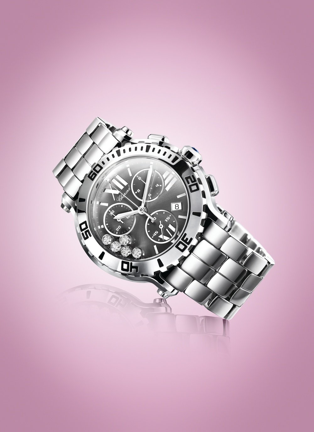 Powerful, contemporary and trendy. Three words to define the very first Happy Sport Chrono on a steel bracelet. With its bold lines and five mobile diamonds decorating the dial, this timepiece will delight strong-minded women who appreciate sport chic adapted to an active lifestyle.