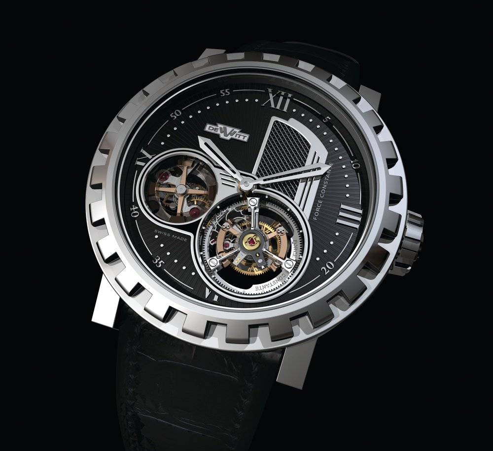 Three years after patenting its ingenious regulation system integrated within the Tourbillon Force Constante Academica, DeWitt has entirely reviewed this stellar model. The in-depth revision of the movement serves to place the formerly off-centred hand-setting in the middle of the dial so as to facilitate read-off. Resolutely avant-garde by nature, DeWitt has also revamped the design of the model in a decidedly virile and modern style. A “car grille” motif surrounded by a rhodium-plated decorative fillet, combined with a tinted glass protecting the tourbillon and the regulating organ, endow this timepiece with a highly mysterious aura of contemporary elegance.