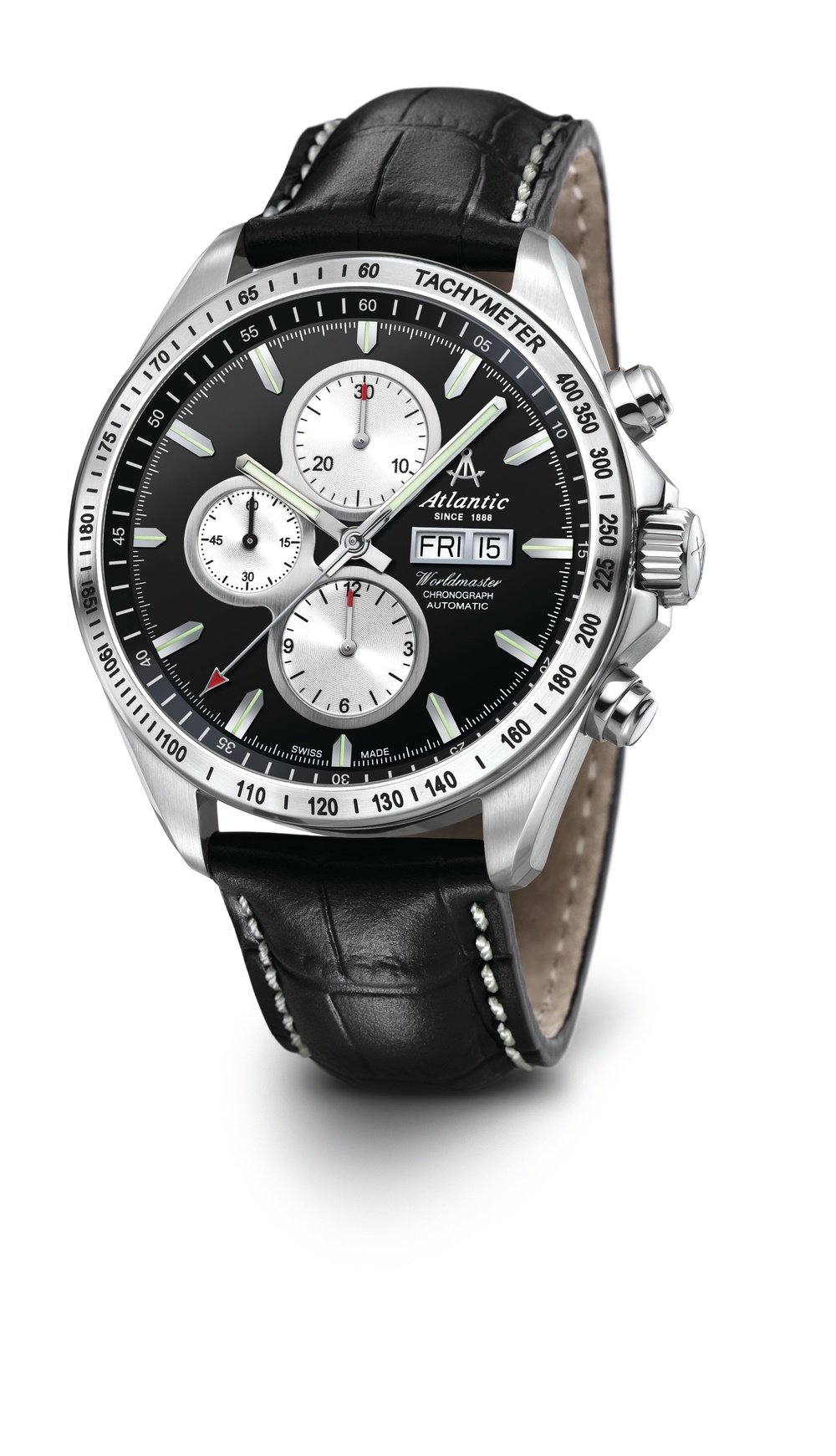 The elegant and sporty Worldmaster Valjoux features a stunning blend of contemporary design, accuracy and rugged charm. Testifying to the Atlantic watchmakers’ flair for details, great care has been devoted to the finishing. The hand-applied hour-markers make a subtle contrast with the tachometer and the guilloché chronograph counters and small seconds subdial, while the sapphire crystal enables one to admire the Vajoux movement adorned with a Côtes de Genève motif.
