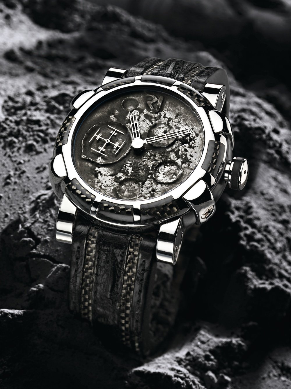 Alternately reddish or ochre-coloured, brilliantly luminous or veiled in black, the moon reveals an infinite palette of subtle nuances to the naked eye. Nonetheless, the accounts given by astronauts who have seen it from close up testify to an entirely different reality. When viewed at close range, it turns out to be a bleak and grim landscape composed of dreary shades of grey, oceans of dust and ashes, cliffs and craters of cooled lava that scientists date back three billion years. To create this light which is foreign to human perception, Romain Jerome has used a revolutionary treatment to coat the dial with a mineral layer comprising authentic moon dust combined with natural pigments. Limited edition of 1,969 watches.