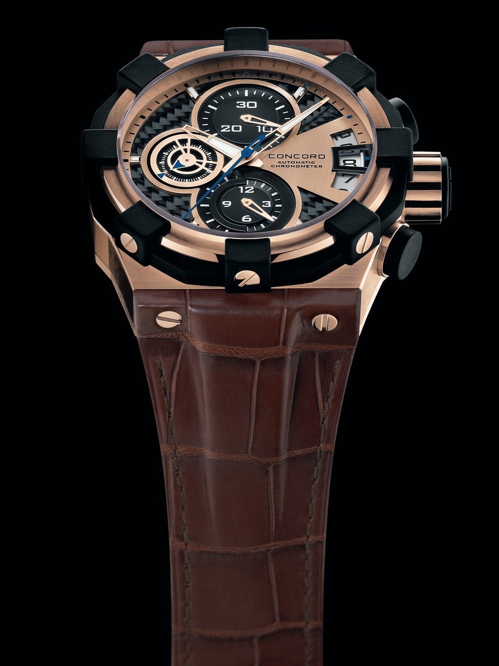 A clever blend of classicism and futurism, the C1 Chronograph Rose Gold is equally at ease in sports activities as in an urban context. Its elegant rose gold case creates subtle contrasts with the carbon fibre dial and its high-tech elements adorning the bezel. This strong effect is softened by a brown alligator leather strap secured directly to the case with no lugs, one of the signature features of the famous C1.