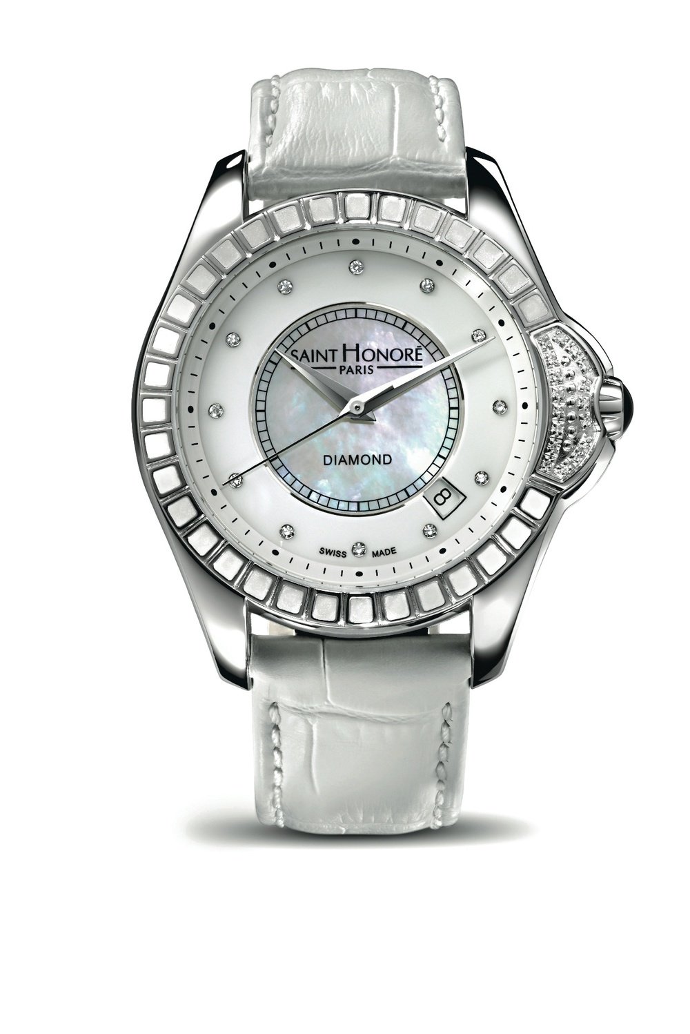 The new Coloseo ladies’ watch by Saint Honoré features a wealth of details! Small cloisonné-lacquered trapeze shapes on the bezel light up the delicate mother-of-pearl dial punctuated by diamonds, featuring an elegantly contrasted date window. No less than 21 diamonds forming an original off-centred pavé motif accentuate the unusual design of the crown guard, while a black onyx lends an ultimate touch of perfection to the new star among sporting chic ladies’ watches.