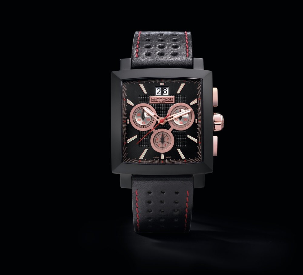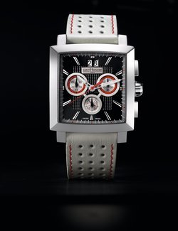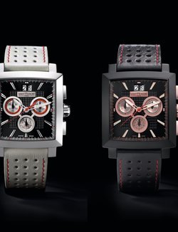 Strapped to the wrist of motor-racing driver Paul Belmondo, the Orsay Black Racing chronograph has taken part since its 2005 launch in such legendary competitions as the Paris-Dakar rally of the Le Mans 24 Hours race. Inspired by the “beautiful cars” of the 1970s, the vintage spirit of the Orsay Black Racing 2009 is revealed in particularly meticulous finishing such as a dial alternating smooth, guilloché or brushed surfaces and a perforated strap with red overstitching. Powered by a 1/10th second chronograph movement and available in steel or black PVD-coated versions, this model is issued in a limited series of 250.