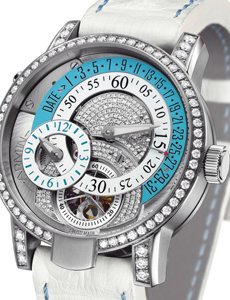 The Regulator Fire is part of the first Armin by Armin Strom collection - 100% developed and assembled in the brand’s workshops - and displays the fiery character of its element. The date’s retrograde display is the watch’s focal point, with the hours, minutes and seconds off-centre. The apertures on the dial carry on the tradition of skeleton watches that is so important to Armin Strom, and the engraved movement can be admired through the sapphire crystal back. This collection is available in five versions: Water, Air, Air Diamonds, Earth, and Fire. Each one reflects the design and colours of its element.
