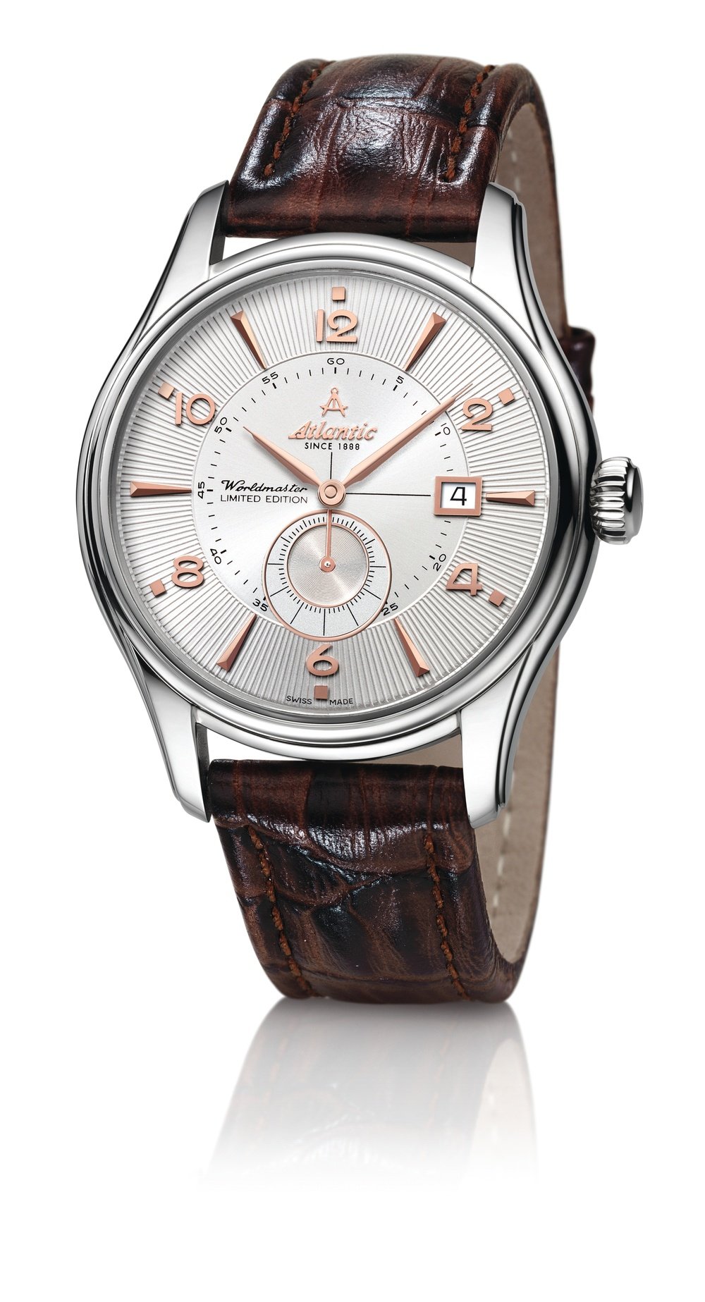 Equipped with an automatic movement, the Worldmaster Big Original 1888 pays tribute to a distinctive best-selling model. This timeless yet modern model embodies all the elegance of a classic watch. Teamed with a noble calfskin leather strap, its refined case profile, its structured dial with sunburst motif, the hand-applied hour-markers and large numerals, as well as the asymmetrical small seconds, combine to offer a worthy homage to the history of the Atlantic brand.