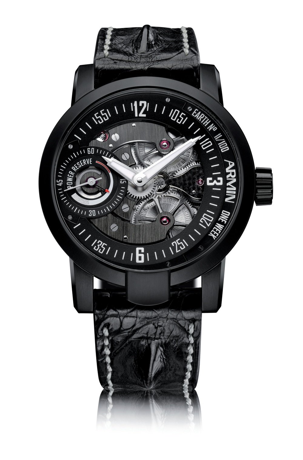 Housing an ultra-exclusive movement – the very first made entirely in the Armin Strom workshop and boasting a 7-day power reserve – the One Week collection embodies the brand’s high level of excellence. The movement is partially engraved, chamfered and hand-polished in the purest Armin Strom tradition to highlight the richness of its mechanism. The visible crown wheels and hand-setting mechanism, the main elements of the three-part dial, give this highly recognizable timepiece its technical and innovative style. The series is available in four versions – Earth, Water, Air and Fire – and limited to 100 of each.