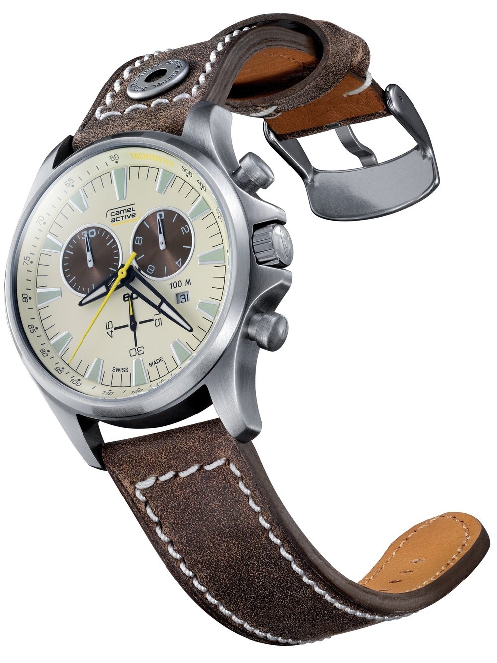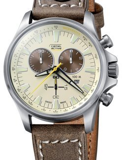 Retro-modern in inspiration, the Aviator Chrono reflects the workwear style of the industrial age, just like Camel Active’s entire Homebound Discovery collection. The high performance of a quartz chronograph movement tested to a depth of 100 metres, the ruggedness of a large 46 mm case with a brushed finish for a vintage look, and the virile bracelet with its characteristic rivets all add up to a timeless design. The Aviator Chrono has everything you need to conquer time in both extreme and everyday conditions.