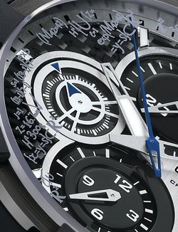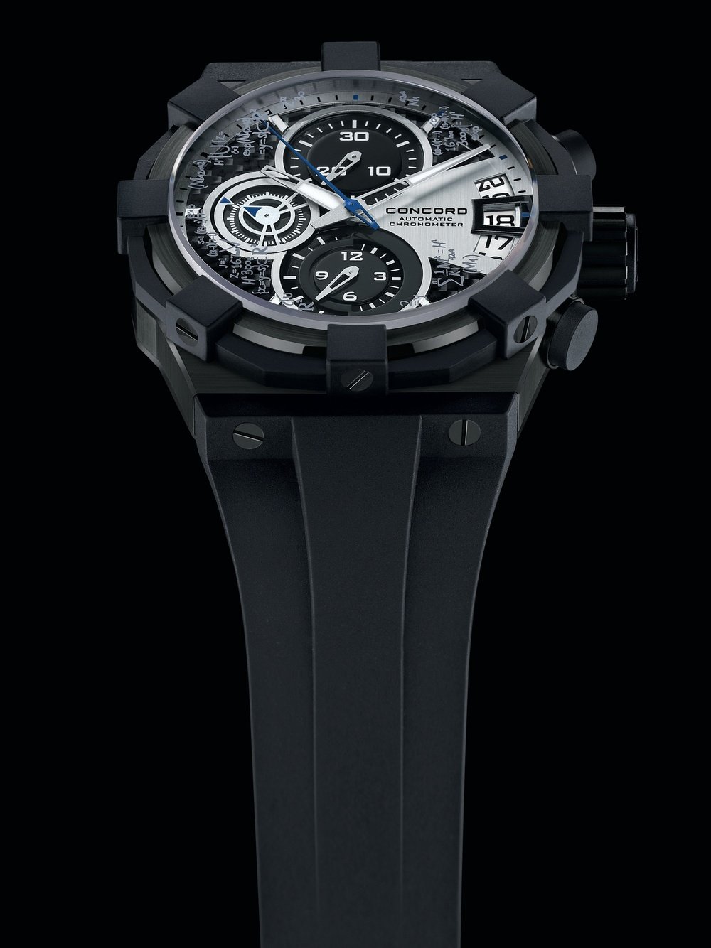 Logical, methodical and highly efficient, the new C1 Code chronograph is making a statement. The algebraic formula above the dial expresses the structural complexity of the case and partially covers the impressive sapphire crystal. The equations are fitted around the various counters, an unequivocal assertion that Concord watches are supreme pieces of engineering.