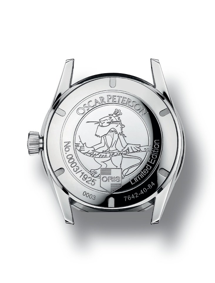 In a tribute to one of the greatest jazz legends, the Oscar Peterson watch is being offered in a limited series of 1,925 pieces, the same number as the year the musician was born. Piano keys – the piano was his favourite instrument – are reproduced on a black grooved dial reminiscent of a vinyl record. Engraved on the numbered back is the lion that the virtuoso used as a symbol, a virtuoso who also loved watches, particularly those with Roman numerals. The ultimate allusion, Oris has plated the VIII on the dial with pink gold, a reference to the eight Grammy Awards the musician collected during his career. The watch is delivered in a varnished wooden box along with a certificate and DVD.