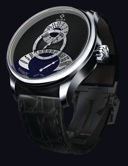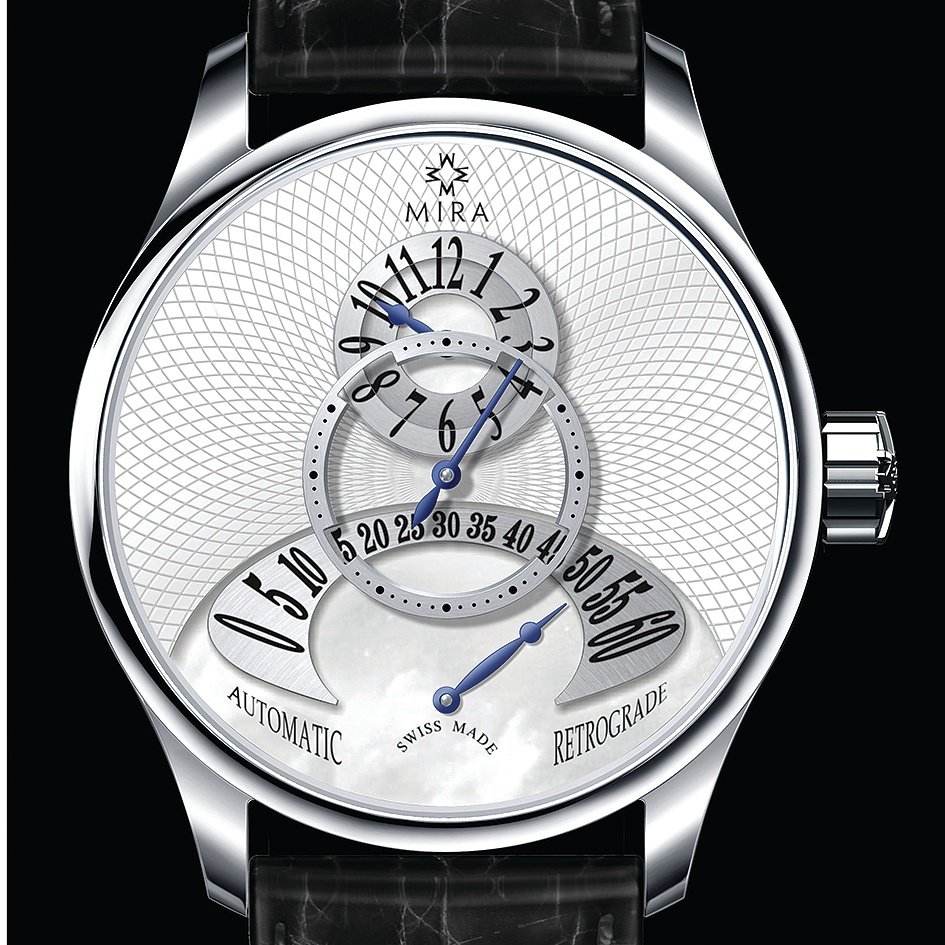 The star that was baptised Mira in 1662 also gave its name to a watch brand in 1896, a quality brand that introduced a two-way rotor in the 1940’s, the portent of today’s automatic watches. A variable star, Mira is shining brightly again after a long eclipse. Its renaissance was inspired by the syzygy, the alignment of celestial bodies on the same gravitational axis. A perfect conjunction, Mira’s Space Sensation aligns the retrograde minutes in the lower part of the mother-of-pearl or aventurine dial, a small seconds at its centre and an hour display in the upper part. The Mira logo, the 4th celestial body, takes place of honour at the very top of the dial, a dramatic completion of this unique syzygy.