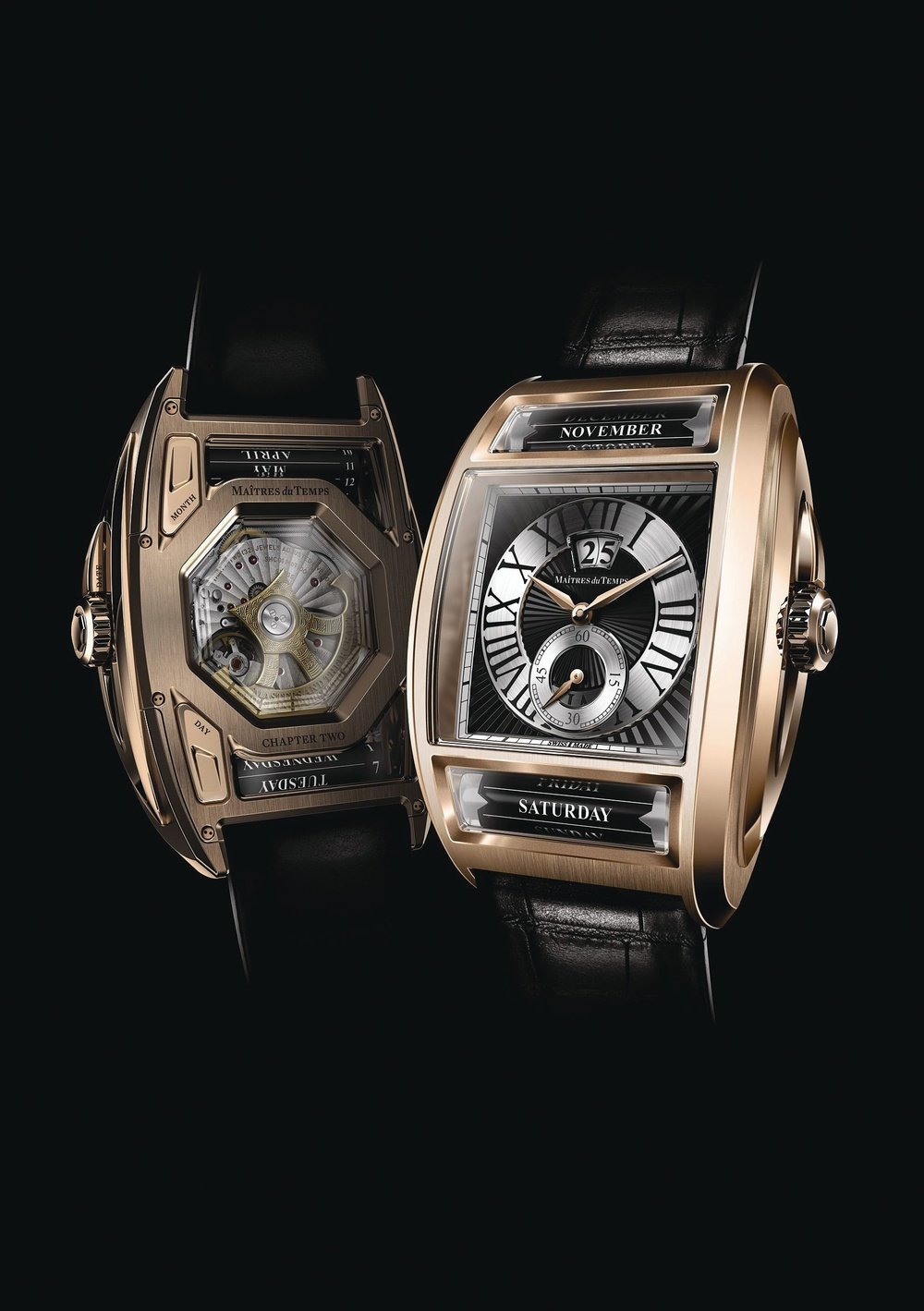 The fruit of collaboration between renowned master watchmakers like Daniel Roth and Peter Speake-Marin, Chapter Two is the world’s most legible instantaneous triple calendar timepiece. It features a big date, day of the week, and month presented in letters on their respective rollers at 6 and 12 o’clock.