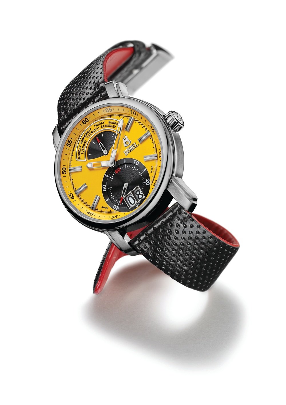 Masculine, resolute and distinguished. A sporty design – a yellow dial for the punch and a two-toned strap for originality – combined with useful complications – large date, retrograde days and small seconds – make the Rocky II Series a must for men who want to express their individuality.