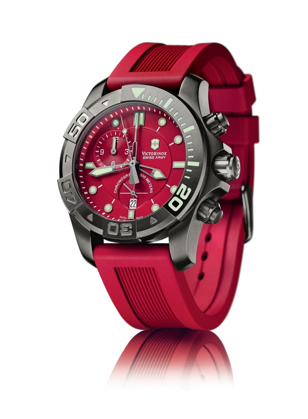 Timing comes together with the world of diving in this new Dive Master 500, with its highly original chronograph with a central minutes and seconds display. Water-resistant to 500 metres, it is both robust and functional. It has excellent legibility thanks to its luminescent hands, hourmarkers and numerals, on the dial and on the unidirectional rotating bezel, and is equipped with a truly sporty Black Ice PVD TM case. A contemporary watch par excellence, this new model from Victorinox Swiss Army is available in black, red or orange.