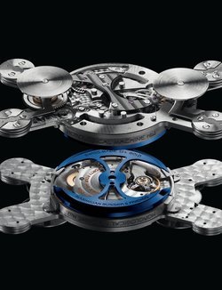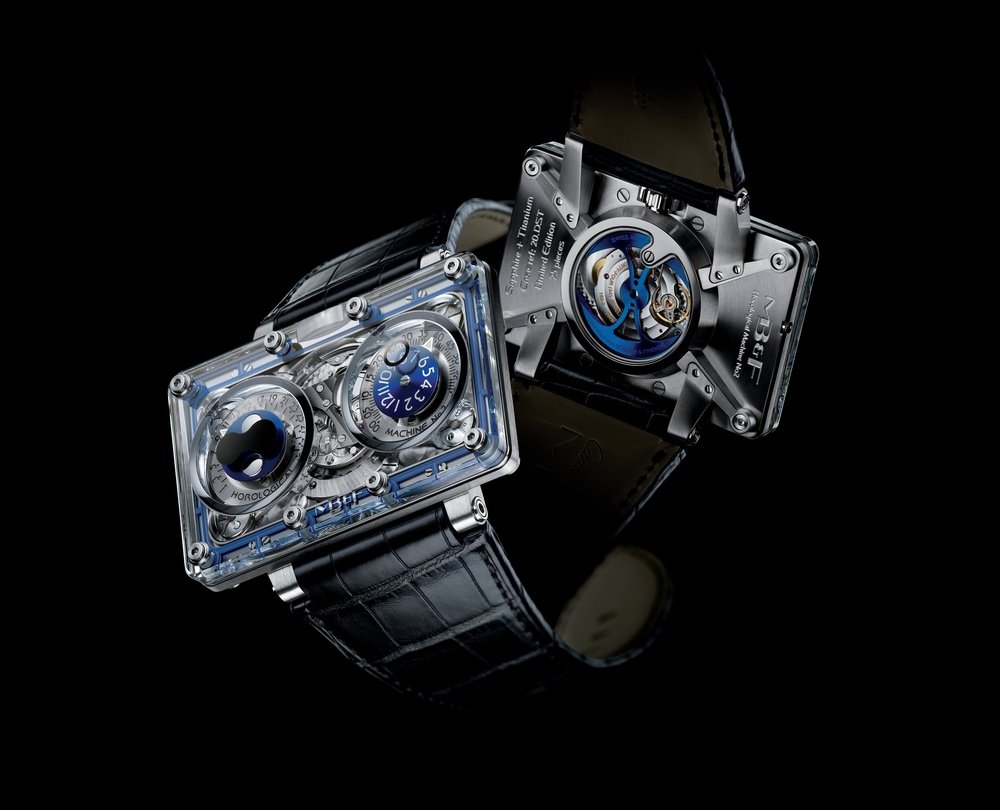Thanks to the sapphire case, the richness of this timepiece’s 349-component movement is revealed in all its crystalline purity. The construction of the Horological Machine N° 2-SV is an amazing feat considering its complex 3-dimensional architecture and the extreme hardness of the sapphire, a very difficult material to work with. It has pushed back the very limits of technology, an achievement that only the movement can rival. It is, in fact, the only mechanical movement in the world to offer an instantaneous jumping hour, concentric retrograde minutes, a retrograde date, a double-hemisphere moon phase, and automatic winding. The patented asymmetrically-toothed gear-trains used for the jumping hours and retrograde minutes guarantee a remarkable level of precision and performance and use very little energy. Limited series of 25.