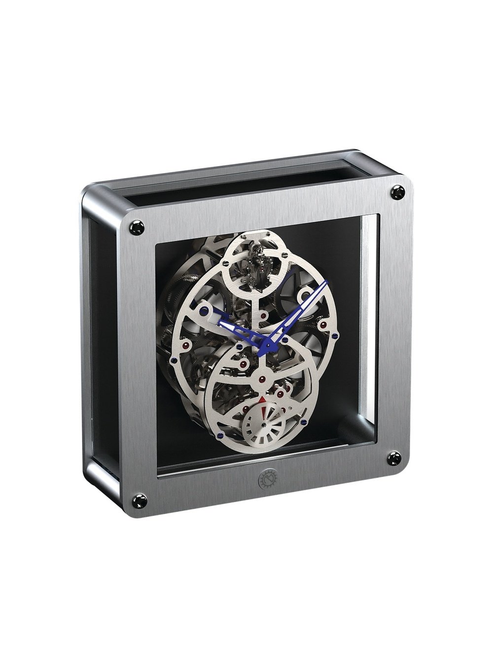 Dedicated to enthusiasts of fine mechanics, this clock displays a remarkable five-barrel movement, with a 40-day power reserve, presented in the form of an open disc and vertical escapement. The two openings on the back act like a light shaft, revealing the splendour of the mechanism, a blend of design and horological excellence. Limited series of 50.