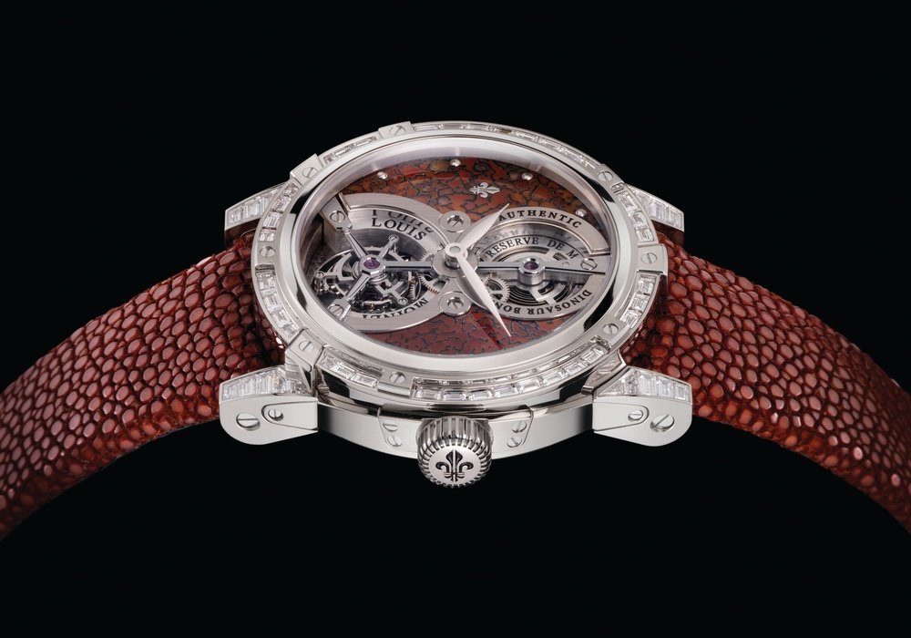 The Jurassic Tourbillon, whose dial contains fragments of authentic fossilised dinosaur bones, takes us on a journey into the past, around 130 million years ago. Qualified as exceptional by experts, the colour and veining of these precious witnesses to our past underwent a meticulous process of preservation. A veritable initiatory exploration, this first piece of a limited series of 12 watches comes in a time-travelling case: the Time Explorator. This “treasure chest of origins” features an “engine-room” comprising counters, handles, levers, gear-trains and pipes in copper and brass. Made of acajou, the Time Explorator is three metres long and two metres high. Its nine windows, which represent the key dates in the history of man, are an invitation to make unexpected discoveries.