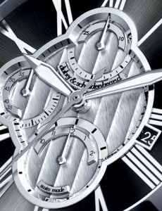 Dubey & Schaldenbrand are launching a new high-performance Spiral model that beats at 28,800 vib/h. This chronograph movement with its top-of-the-range finishing is housed in an appropriately high-tech case: surgical steel, and sculptural pushpieces and horns with alternating satin and polished finishing. The multi-levelled dial reveals recessed counters in a highly contemporary architectural setting. Large Roman numerals encircle the counters to help extend the construction of this little mechanical jewel.