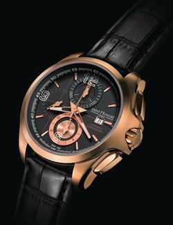 Imposing both in shape and size (44mm), the new Coloseo Valjoux stands out by virtue of its fine features and the care lavished on details: luminescent hour-markers, open-worked hands, and the crown engraved with the SAINT HONORE logo characterise the titanium PVD version. As for the pink gold version, it couples coherence with refinement, thanks to its pink gold-plated hour-markers, small seconds and chronograph hour-counter.